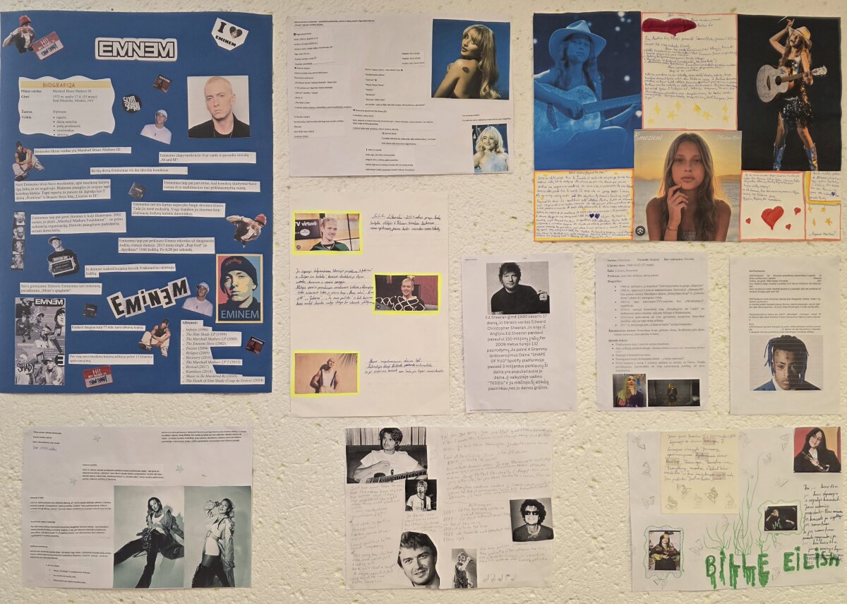 Muzikos pamokose 4 klasės mokiniai leidosi į įdomią kelionę po muzikos pasaulį – analizavo, kas kuria muziką ir kas ją atlieka, diskutavo, kas yra gera muzika ir kodėl vieni kūriniai bei atlikėjai išlieka aktualūs labai ilgai. Pamokų metu mokiniai svarstė, kokie muzikantai ir muzikos stiliai turi išliekamąją vertę, kuo išsiskiria klasikinė, džiazo, populiarioji ar šiuolaikinė muzika, ir kodėl tam tikri kūriniai laikomi kokybiškais bei reikšmingais. Diskusijose buvo akcentuojamas kūrybiškumas, emocinis poveikis, originalumas ir kultūrinė vertė. Taip pat mokiniai susipažino su reklaminio plakato kūrimo etapais ir vertinimo kriterijais: idėjos pasirinkimu, informacijos atranka, vizualiniu dizainu bei aiškia žinute auditorijai. Įgytas žinias jie pritaikė praktiškai – parengė pristatymus apie savo mėgstamus atlikėjus, jų kūrybą ir indėlį į muzikos pasaulį. Ši veikla ne tik ugdė mokinių muzikinį skonį, bet ir skatino kritinį mąstymą, kūrybiškumą bei gebėjimą argumentuotai išsakyti savo nuomonę.