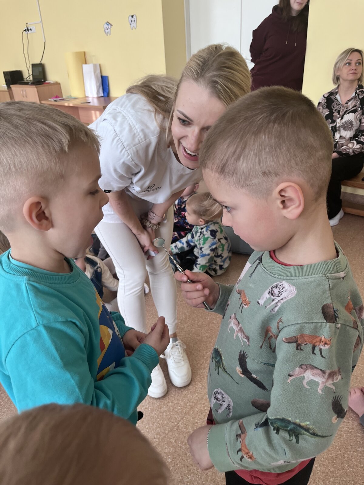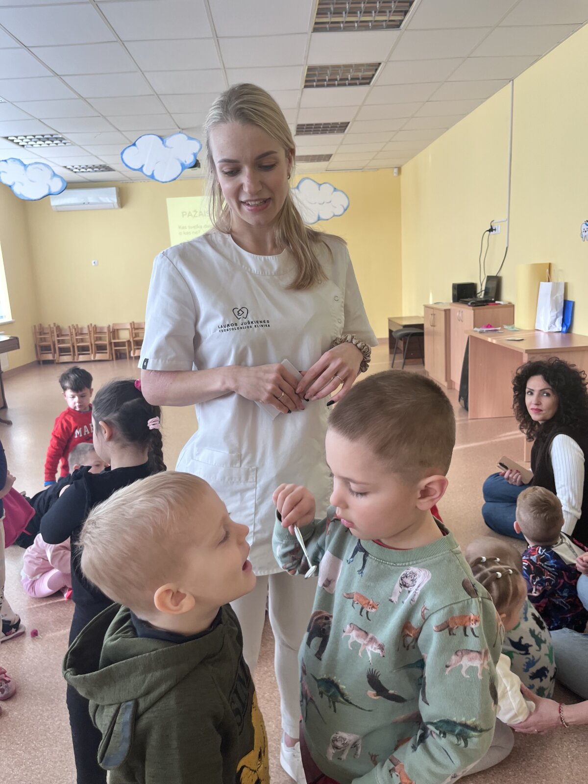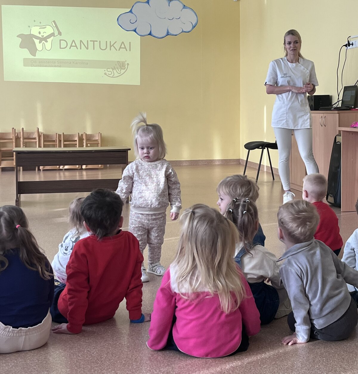 Vieną antradienio rytą vaikai susitiko su Nojaus mama Simona Karolina Dumbliauskiene, odontologo asistente. Ji žaismingai pasakojo apie dantukų higieną, kartu su vaikais aptarė „draugiškus“ ir „nedraugiškus“ produktus dantukams, pademonstravo odontologo naudojamus įrankius.