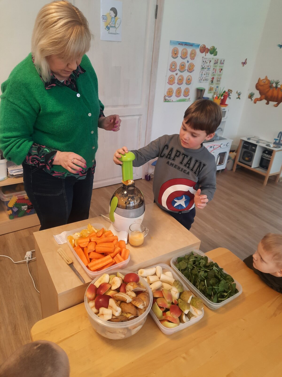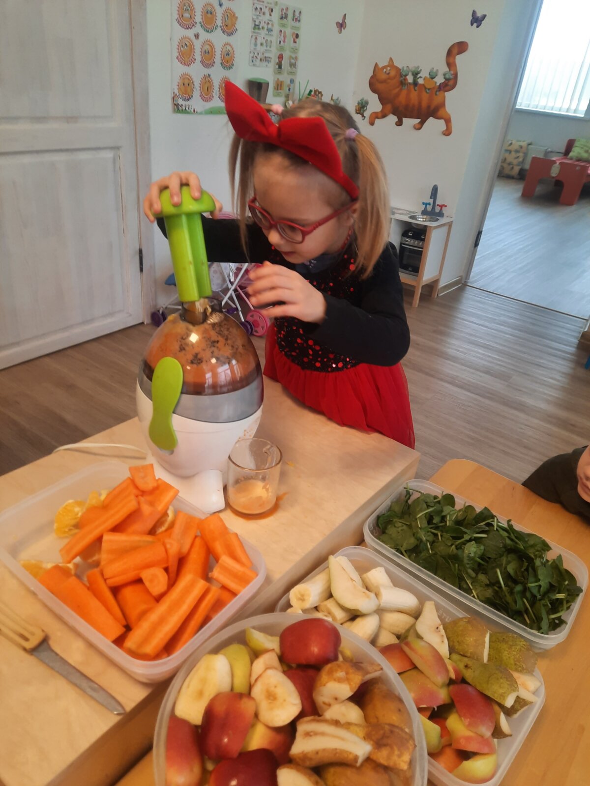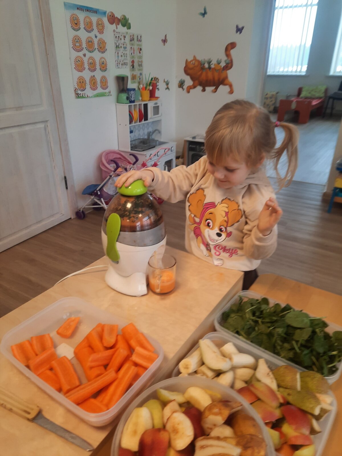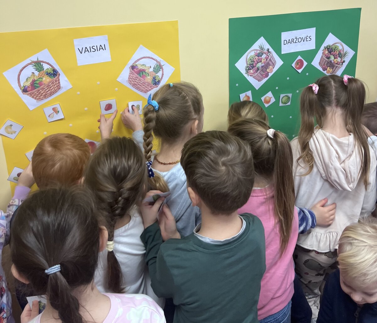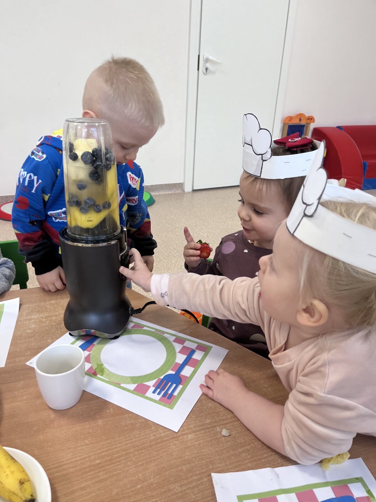 Trečiadieniais vaikai kartu su grupių mokytojomis tapdavo mažaisiais „virtuvės šefais“ – gamino sveikuoliškas salotas, spaudė sultis, plakė kokteilius, vėrė vaisių vėrinukus, mokėsi stalo serviravimo subtilybių.