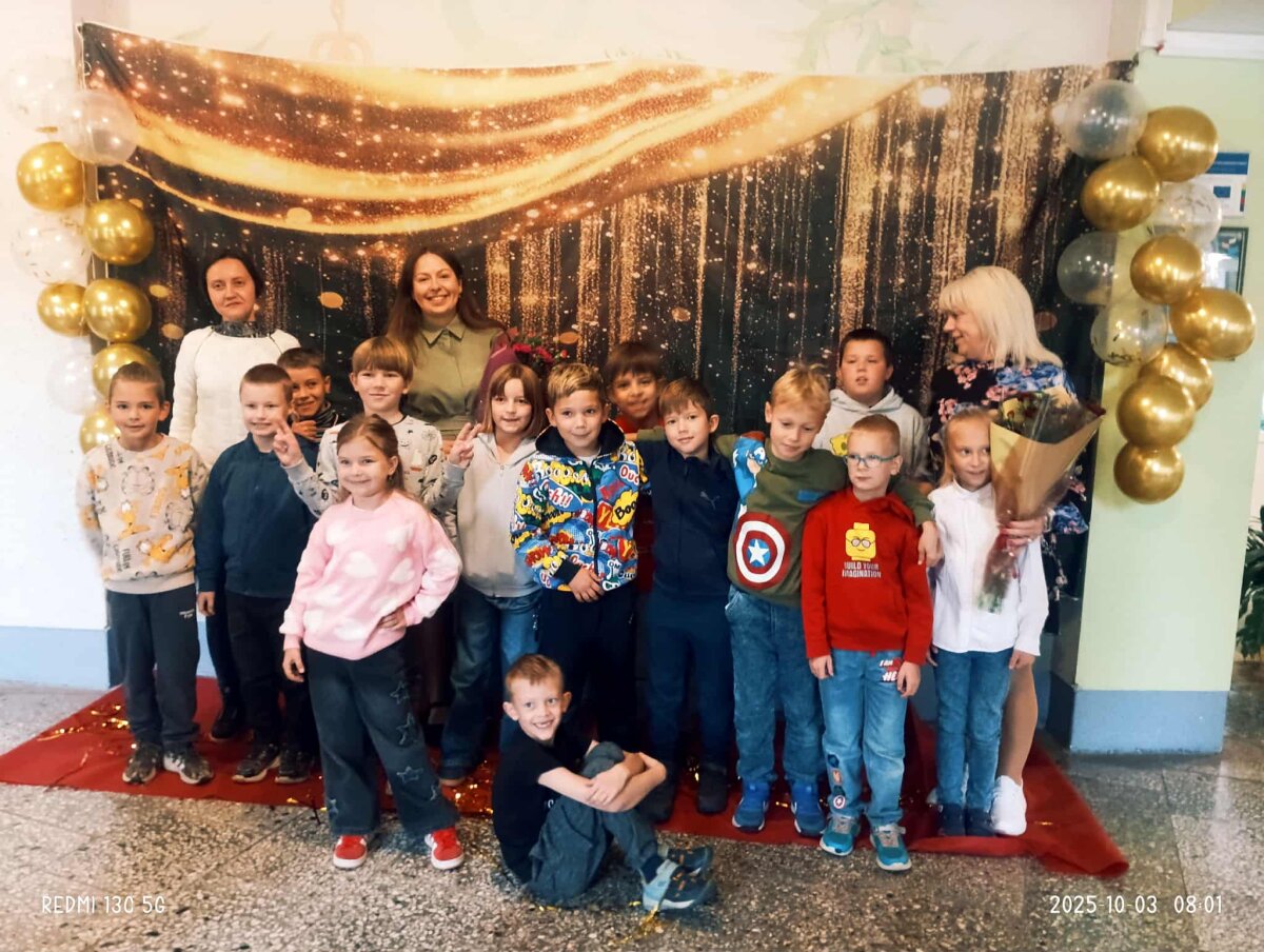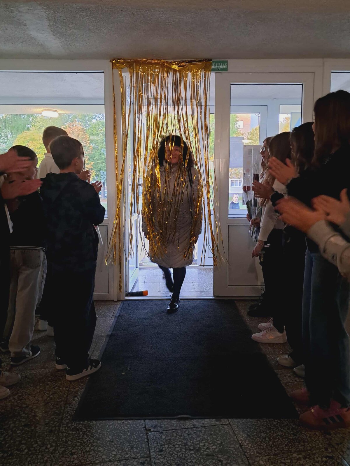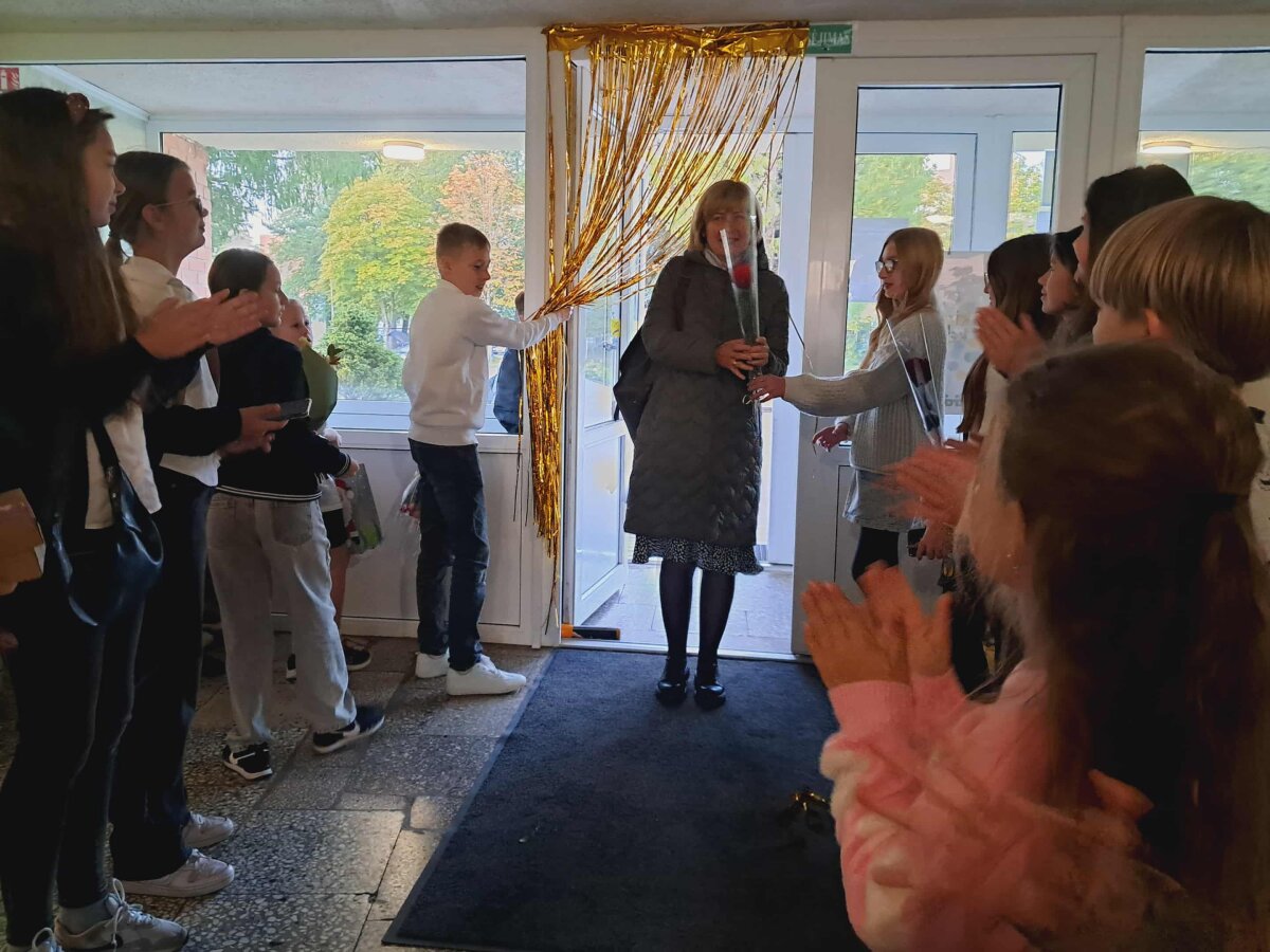 Šįryt, vos pravėrus progimnazijos duris, mokytojus pasitiko mokinių aplodismentai, ovacijos ir gėlės. Šventiškai nusiteikę visi pedagogai galėjo įsiamžinti prie specialiai paruoštos foto sienelės.