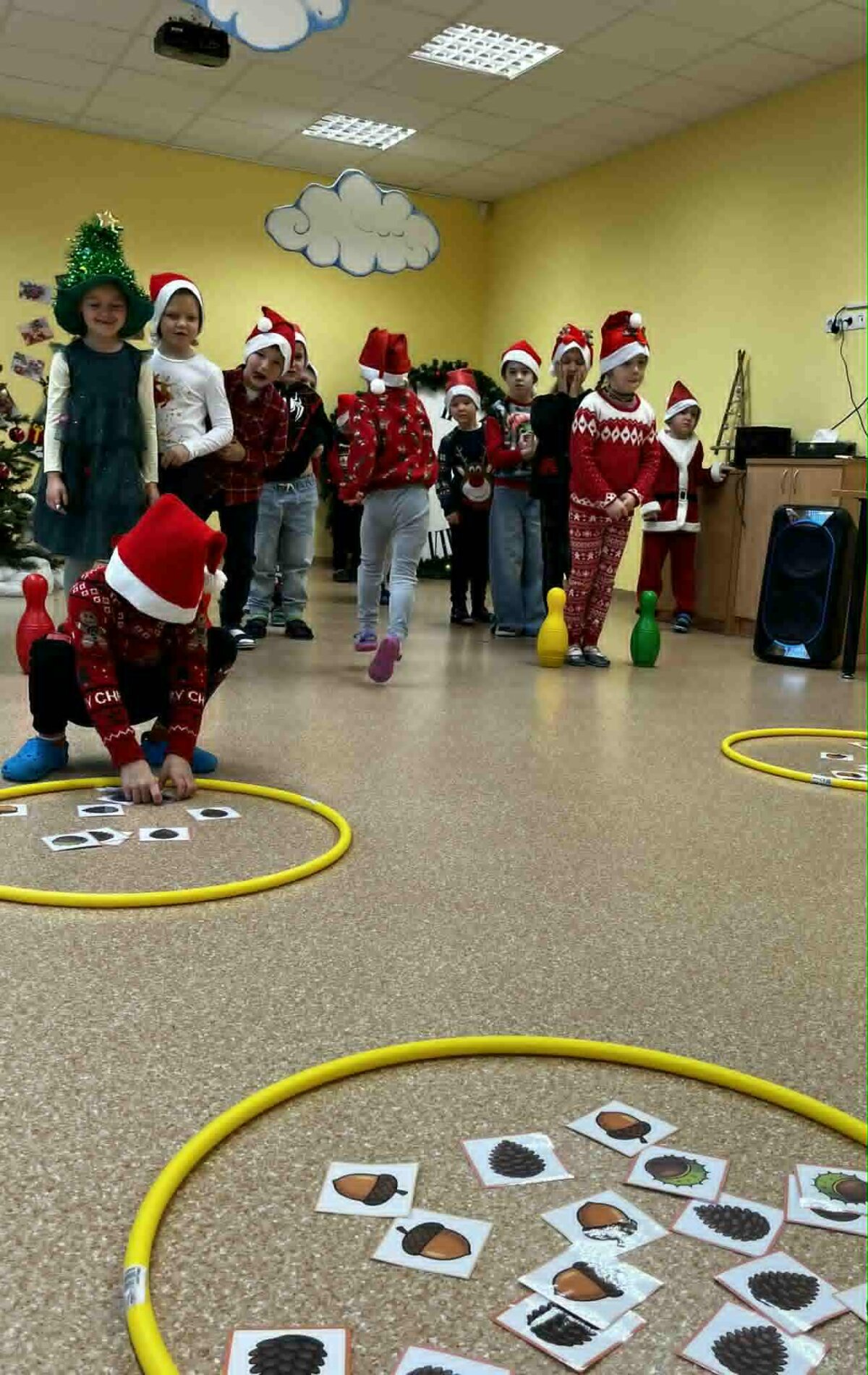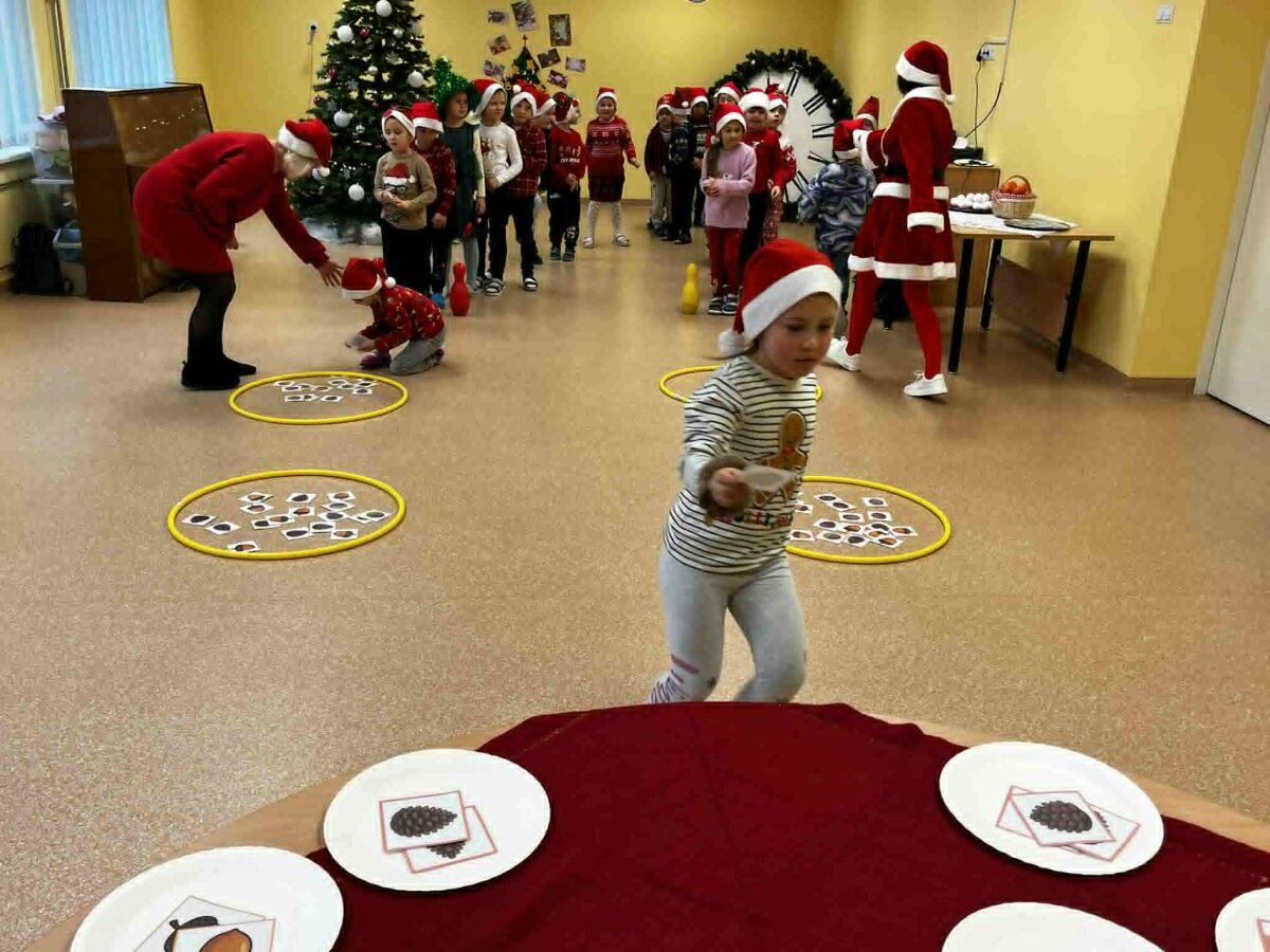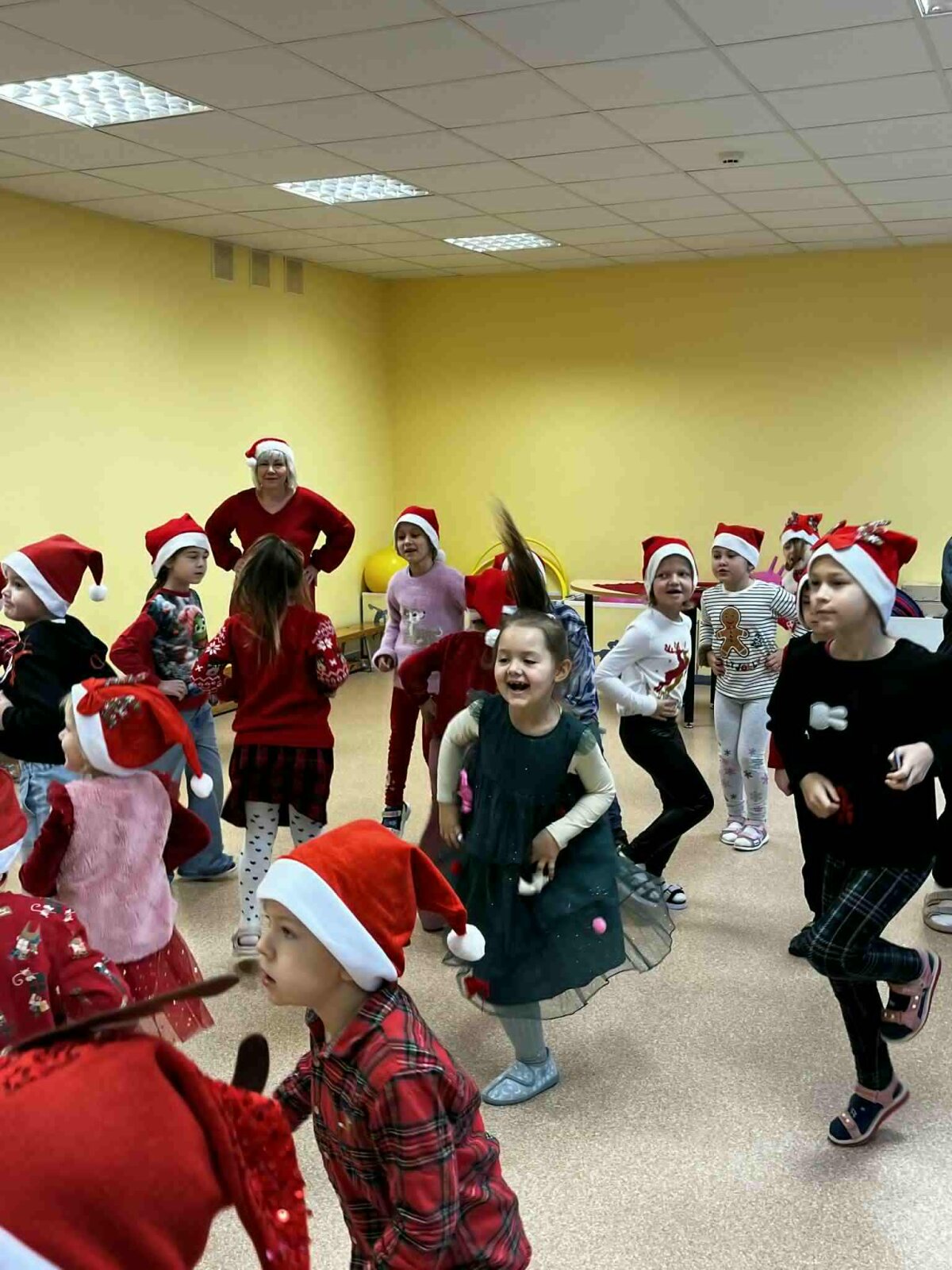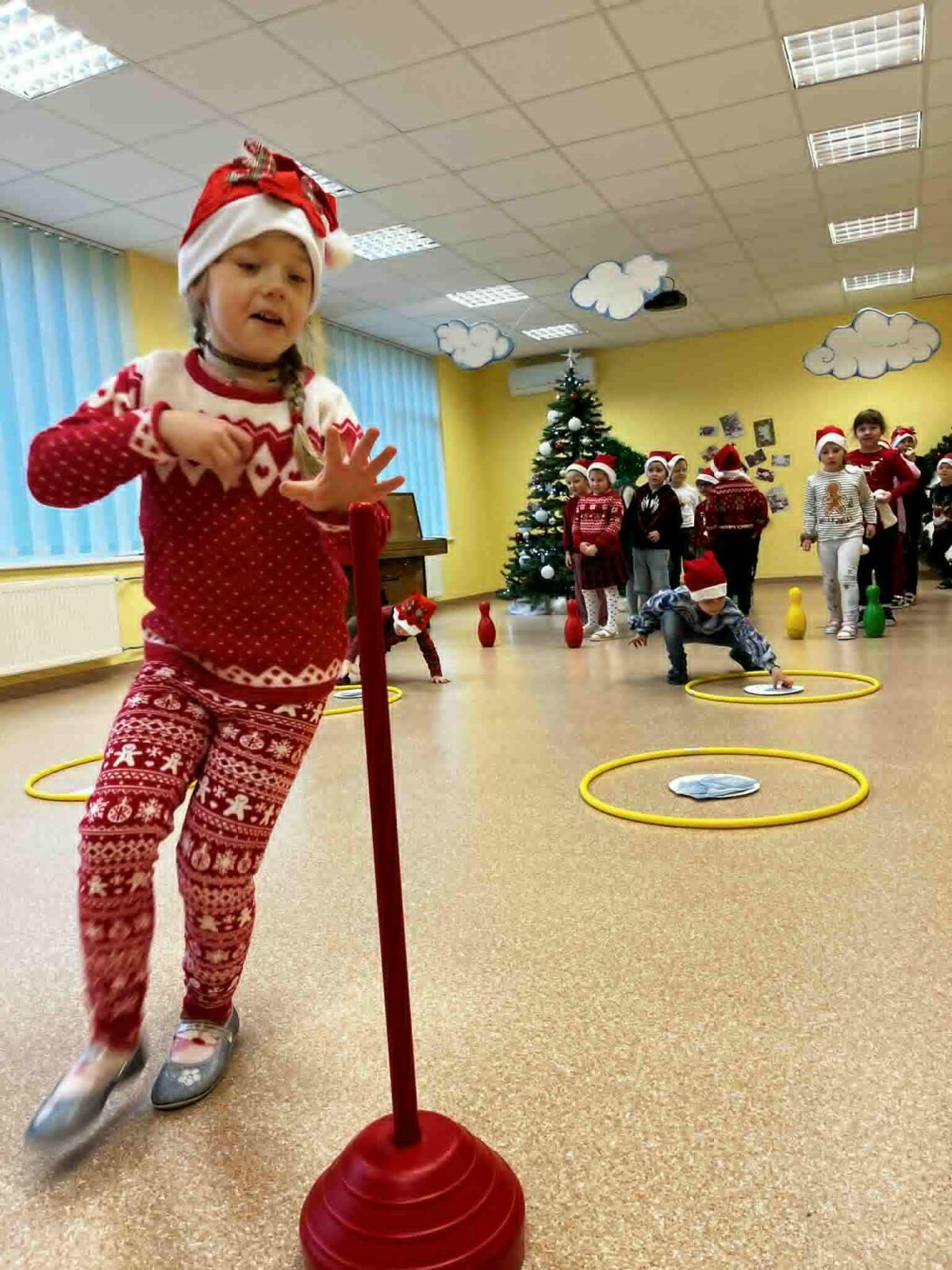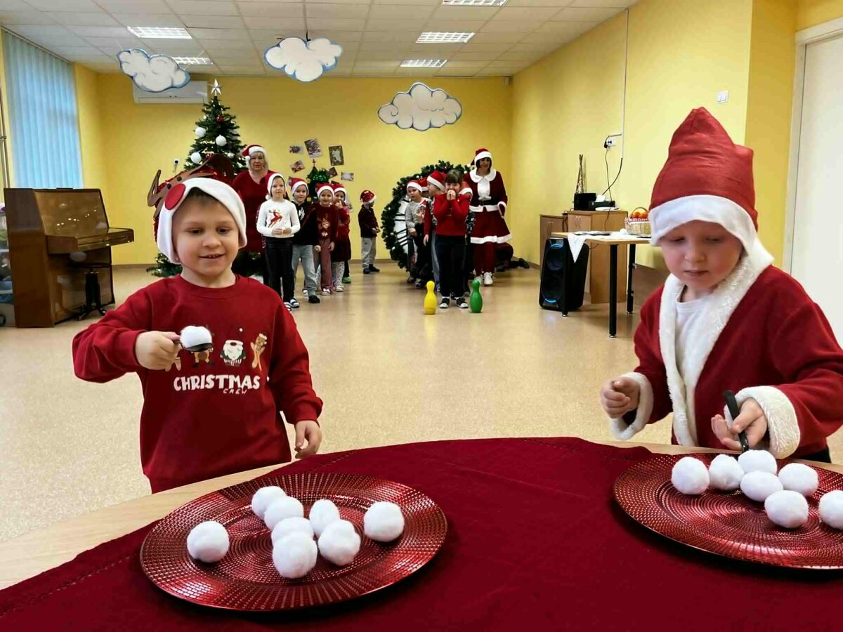 Mažieji nykštukai puošė žaliaskarę eglutę, mankštinosi ir atliko įvairias aktyvias užduotis. Vaikai žaidė, varžėsi estafetėse, šoko ir dainavo – jų juokas ir gera nuotaika pripildė salę kalėdinės šilumos.
