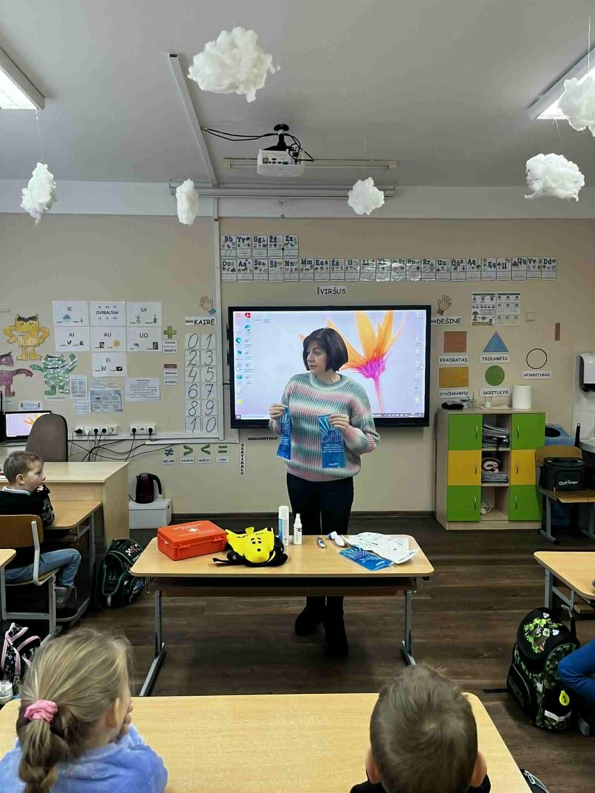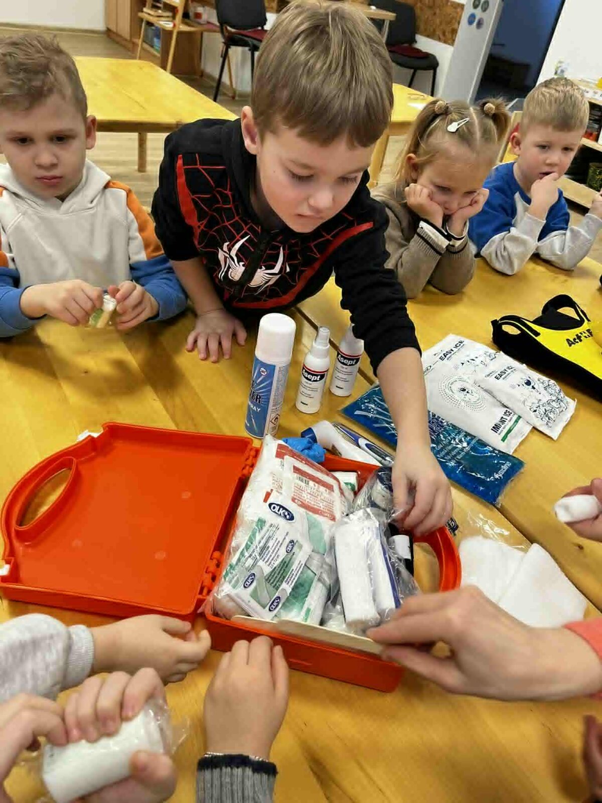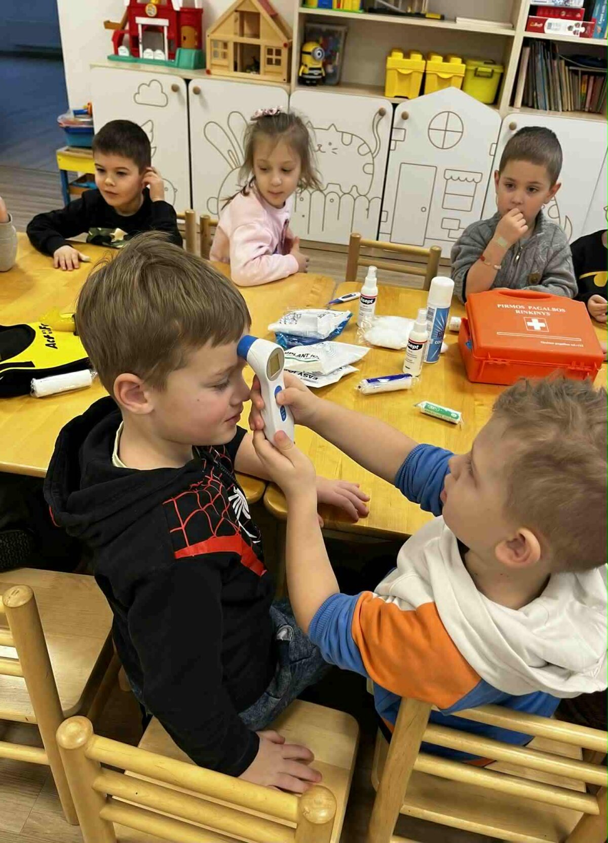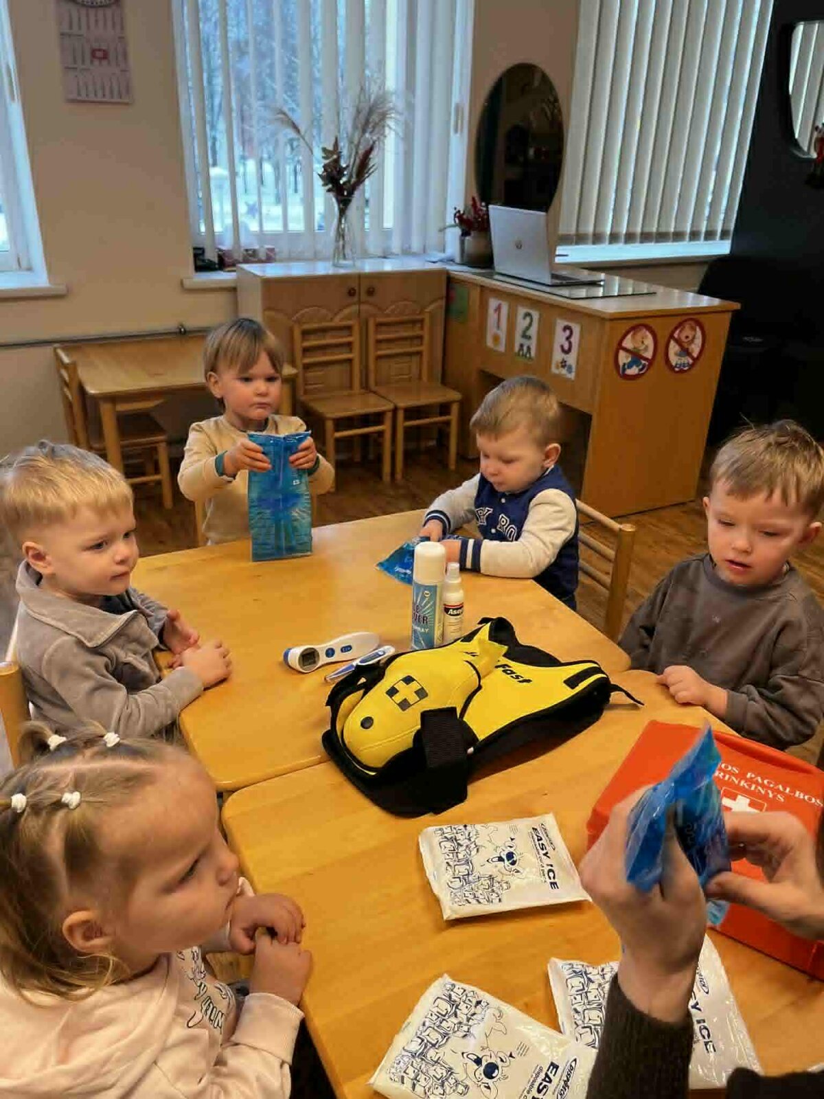 Užsiėmimuose dalyvavo „Draugystės“, „Smalsumo“, „Džiaugsmo“ grupių ugdytiniai, priešmokykliniukai bei 1 klasės mokiniai. Vaikai mokėsi užklijuoti pleistriuką, sutvarstyti sužeistą vietą, pasimatuoti kūno temperatūrą bei uždėti šalčio kompresą esant sumušimui. Taip pat išbandė užspringimo liemenę, susipažino su tarptautiniu užspringimo ženklu ir mokėsi, kaip tinkamai elgtis užspringus.