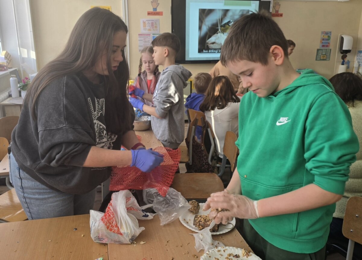 3 klasės mokiniai nusprendė jiems pagelbėti. Technologijų pamokos metu aptarę, kokie paukščiai Lietuvoje žiemoja, kaip jiems galima padėti, koks lesalas tinkamas, o koks ne, kibo į darbus. Mokiniai kartu su Jono mama iš įvairių sėklų, kruopų, taukų gamino paukšteliams skirtus skanėstus, kuriuos vėliau pakabino ant medžių.
