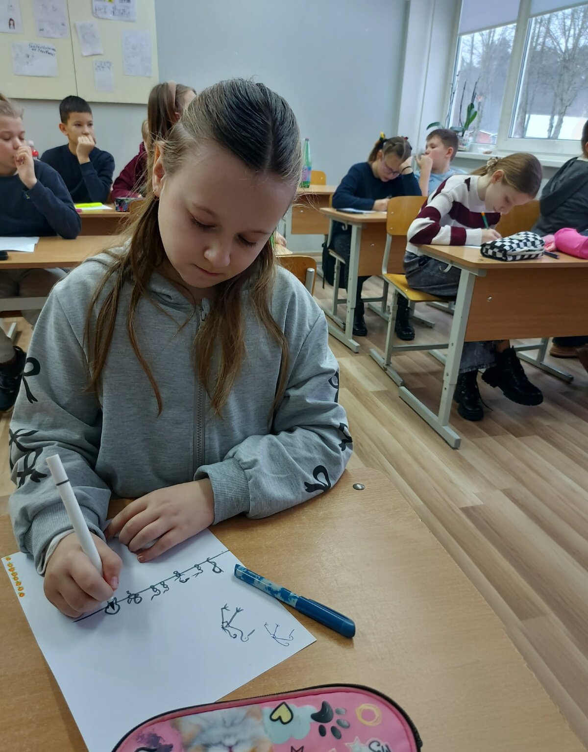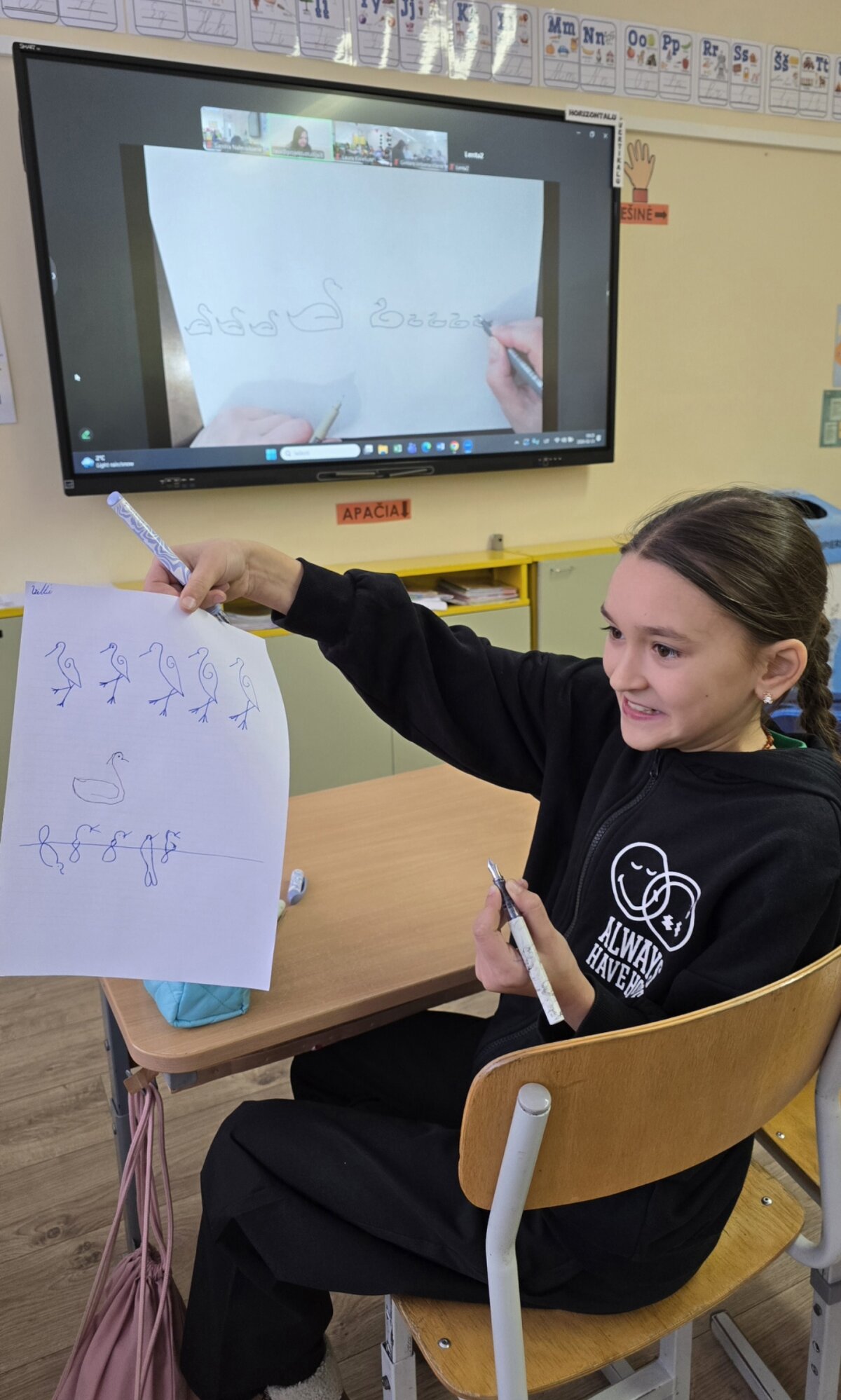 Mokiniai dalyvavo nuotolinėje dailyraščio edukacijoje, kurioje sužinojo apie rašto atsiradimą, mokėsi iš raidžių nupiešti įvairius simbolius ir ženklus.