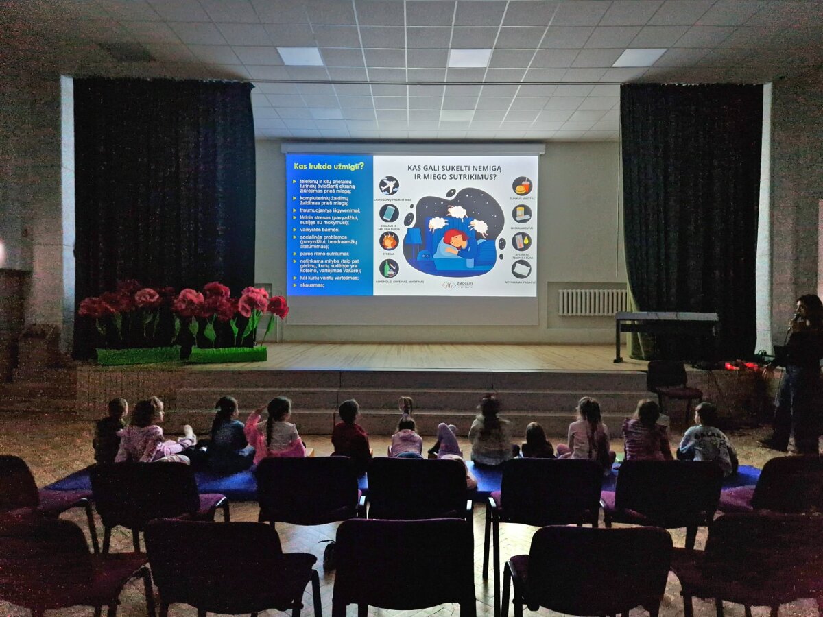 Priešmokyklinio ugdymo grupės „Žingsniai“ vaikai kartu su mokytoja Birute dalyvavo pamokėlėje. Jos metu su socialine pedagoge Kristina aptarė miego naudą. Diskutavo apie tai, kas trukdo užmigti, o kas padeda sulaukti saldaus ir ramaus sapno. Vaikai atliko atsipalaidavimo pratimą, spalvino paruoštą miego užduotėlę.