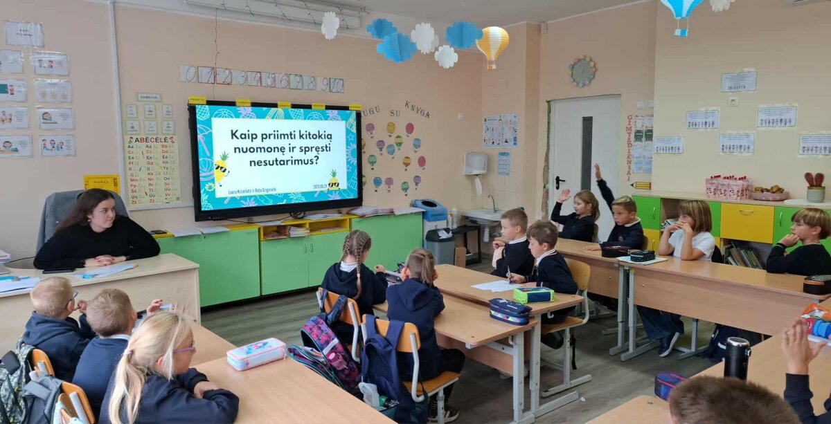 2 klasėje vyko atvira integruota visuomeninio ugdymo ir klasės valandėlės pamoka tema „Kaip priimti kitokią nuomonę ir spręsti nesutarimus?“. Pamoką vedė pradinių klasių mokytoja Laura ir mokyklos psichologo asistentė Rūta. Pamokos metu mokiniai aiškinosi, kodėl žmonės kartais nesutaria, kaip svarbu išklausyti vieniems kitus ir gerbti skirtingas nuomones. Vaikai dalyvavo įvairiose veiklose – klausė trumpos istorijos, diskutavo, žaidė situacinius žaidimus, atliko kūrybines užduotis. Jie mokėsi atpažinti jausmus, mandagiai išreikšti savo mintis ir ieškoti bendrų sprendimų. Pamoka buvo kupina šypsenų ir prasmingų pokalbių. Mokiniai suprato, kad kiekvienas žmogus gali turėti kitokią nuomonę, tačiau svarbiausia – gebėti bendrauti pagarbiai ir draugiškai bei ieškoti kompromisų.